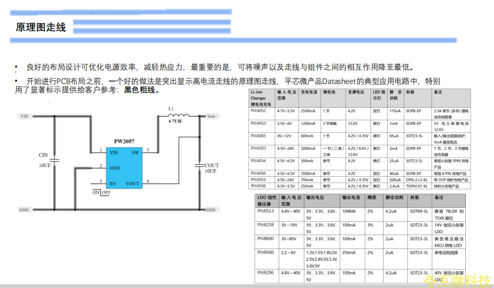PW2057是一个恒频、恒压模式降压转换器。该器件集成了一个主开关和一个同步整流器,无需外加肖特基二极管就可以实