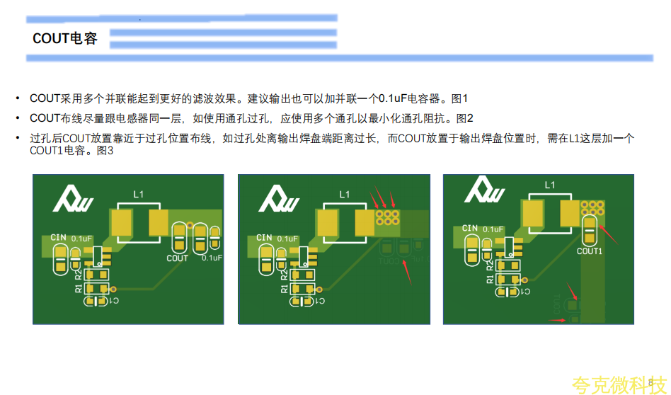 初接触电源设计工程师,在设计时往往忽略了功率地的回路和布线,如下图箭头处,VIN的GND,CIN的GND端,COUT的GND端和VOUT的GND端,这4点,布线要宽的同时,回路连接不宜七绕八绕,要宽和直接。CIN,COUT过孔时,也需要多打孔,布线宽。