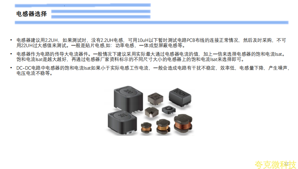 电感器建议用2.2UH,如果测试时,没有2.2UH电感,可用10uH以下暂时测试电路PCB布线的连接正常情况,然后及时采购,不可用22UH过大感值来测试。一般是贴片电感,如:功率电感,一体成型屏蔽电感等。