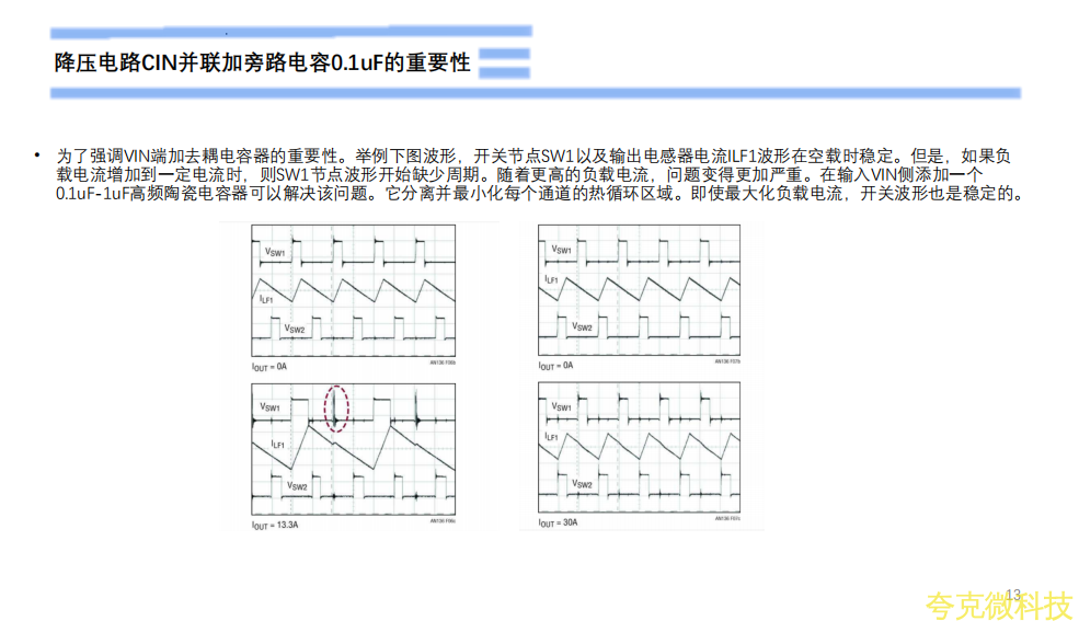 为了强调VIN端加去耦电容器的重要性。举例下图波形,开关节点SW1以及输出电感器电流ILF1波形在空载时稳定。但是,如果负下载电流增加到一定电流时,则SW1节点波形开始缺少周期。随着更高的负载电流,问题变得更加严重。在输入VIN侧添加一个0.1uF-1uF高频陶瓷电容器可以解决该问题。它分离并最小化每个通道的热循环区域。即使最大化负载电流,开关波形也是稳定的。