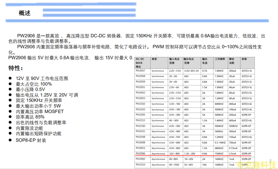 PW2906 是一款高效 、 高压降压型 DC-DC 转换器,固定 150KHz 开关频率,可提供最高 0.6A输出电流能力,低纹波,出色的线性调整率与负载调整率。