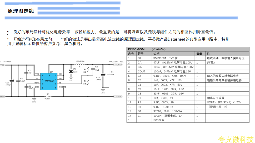 开关电源电路可以分为功率级电路和小信号控制电路。功率级电路包括传导大电流的组件。通常,应首先放置这些组件(PW2906芯片,Q1,D1,R7A,R7B,L1,CIN和COUT)。随后将小信号控制电路放置在布局中的特定位置。电感大电流走线应短而宽,以最小化PCB电感,电阻和电压降.