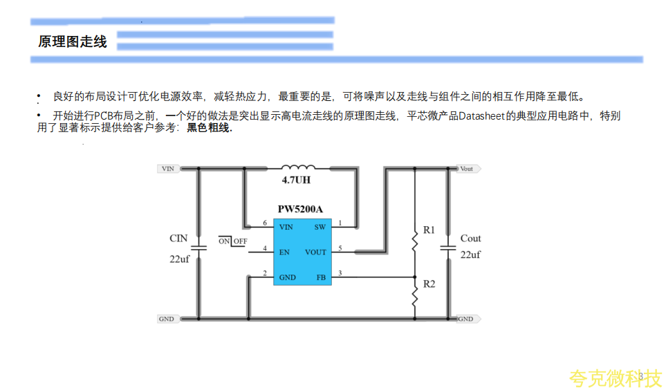 开关电源电路可以分为功率级电路和小信号控制电路。功率级电路包括传导大电流的组件。通常,应首先放置这些组件(PW5200A芯片,L1,CIN和COUT)。随后将小信号控制电路FB放置在布局中的特定位置。电感大电流走线应短而宽,以最小化PCB电感,电阻和电压降。