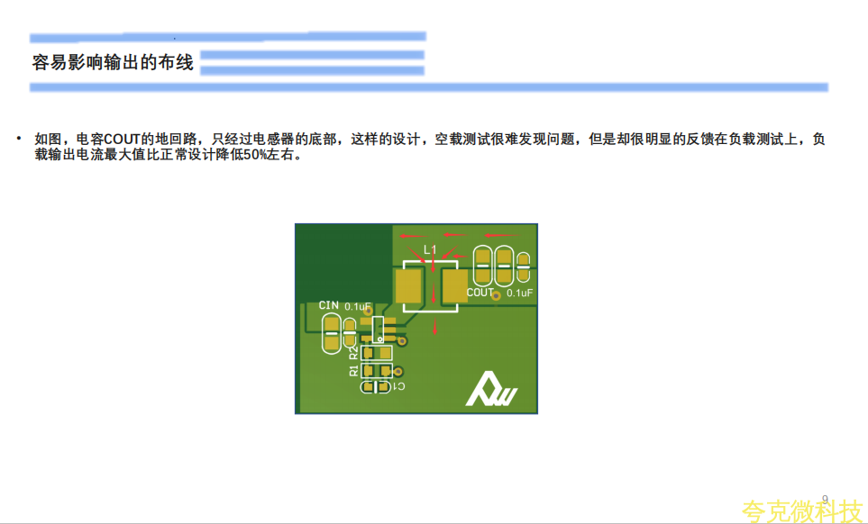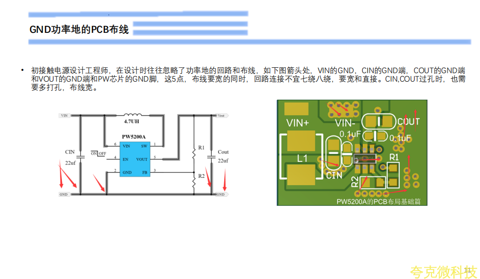 初接触电源设计工程师,在设计时往往忽略了功率地的回路和布线,如下图箭头处,VIN的GND,CIN的GND端,COUT的GND端和VOUT的GND端和PW芯片的GND脚,这5点,布线要宽的同时,回路连接不宜七绕八绕,要宽和直接。CIN,COUT过孔时,也需要多打孔,布线宽。