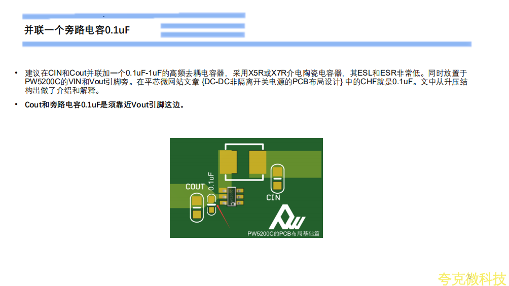 开关电源电路可以分为功率级电路和小信号控制电路。功率级电路包括传导大电流的组件。通常,应首先放置这些组件(PW5200C芯片,L1,CIN和COUT)。随后将小信号控制电路FB放置在布局中的特定位置。电感大电流走线应短而宽,以最小化PCB电感,电阻和电压降。