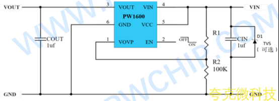 这是PW2609A的核心优势之一。其过压保护阈值并非固定不变,而是可以通过连接在VIN、VOVP和GND引脚之间的两个外部电阻(R1, R2)进行精确设定,范围覆盖4V至24V。计算公式为:V_OVP = 1.2V × (1 + R1/R2)。若将VOVP引脚直接接地,芯片则自动启用内部默认的6.1V阈值,完美适配标准5V USB电源环境。这种灵活性使其能从容应对各种非标适配器或具有多电压档位的电源。