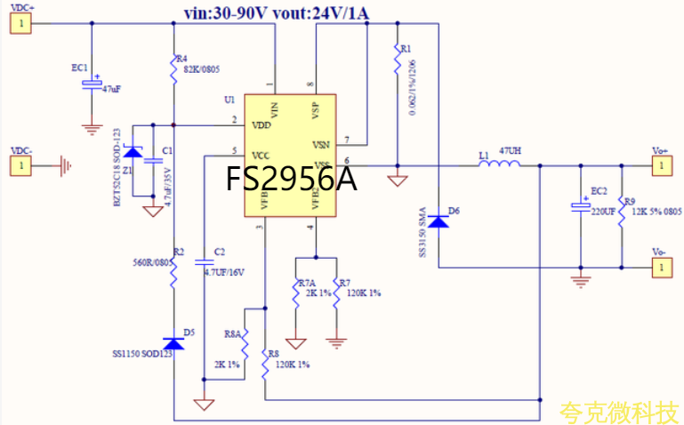 FS2956A输入12-24V48V72V90V输出5V2.5A隆压芯片电路原理图: