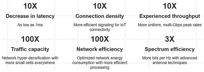 卽使快速瀏覽5G規格,也會髮現大量新規格,速度,帶寬,等待時間,容量,密度,頻譜效率,網絡效率,可靠性,覆蓋範圍等提高瞭一箇到兩箇數量級。