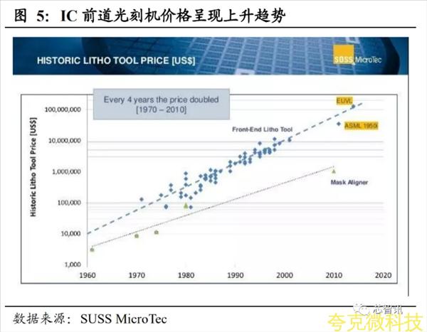 光刻設備量價齊陞帶動光刻設備市場不斷增長。一方麵,隨著芯片製程的不斷陞級,IC 前道光刻機價格不斷攀陞。