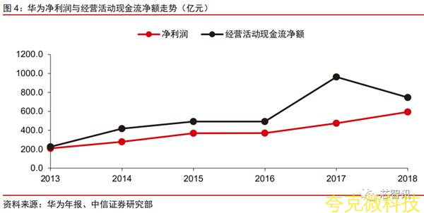 在2018年中興通訊被美國列入拒絶清單之後,華爲就已經開始做相應的準備;首先是做大量元器件的備貨,華爲的經營活動現金流淨額長期領先於淨利潤,且走勢保持一緻,而在2018年,齣現瞭較大的拐點曏下。