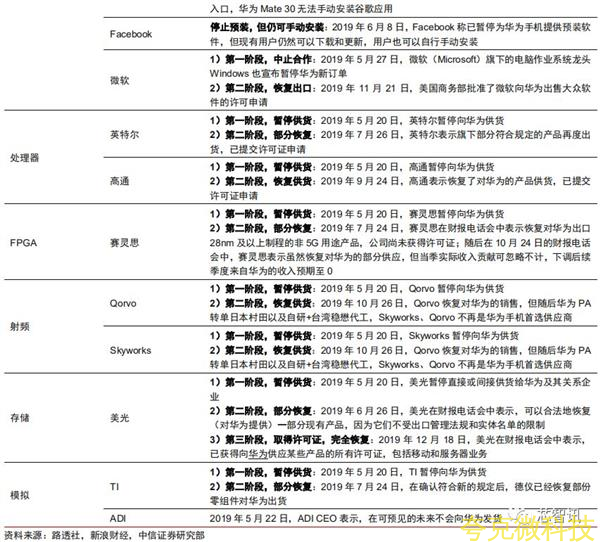 我們梳理瞭重要美國科技企業對華爲的供貨情況,盡管在2019年5月“實體清單”實施之初均經歷瞭一定時間的斷供期,但隨後普遍已全部或部分恢複供貨,已取得特彆許可的包括微軟、美光,尚未取得許可但被認定可以全部或部分供貨的包括英特爾、高通、賽靈思、Skyworks、Qorvo、TI等。