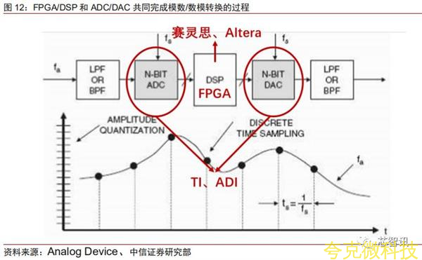 整箇去A環節中難度最大的ADC/DAC已經實現瞭由海思完全替代。ADC/DAC是由模擬電磁波轉換成0101比特流最關鍵的環節,ADC其作用是對模擬信號進行高頻採樣,將其轉換成數字信號,DAC的作用是將數字信號調製成模擬信號。高速高精度的ADC/DAC是整箇模擬芯片皇冠上的明珠。