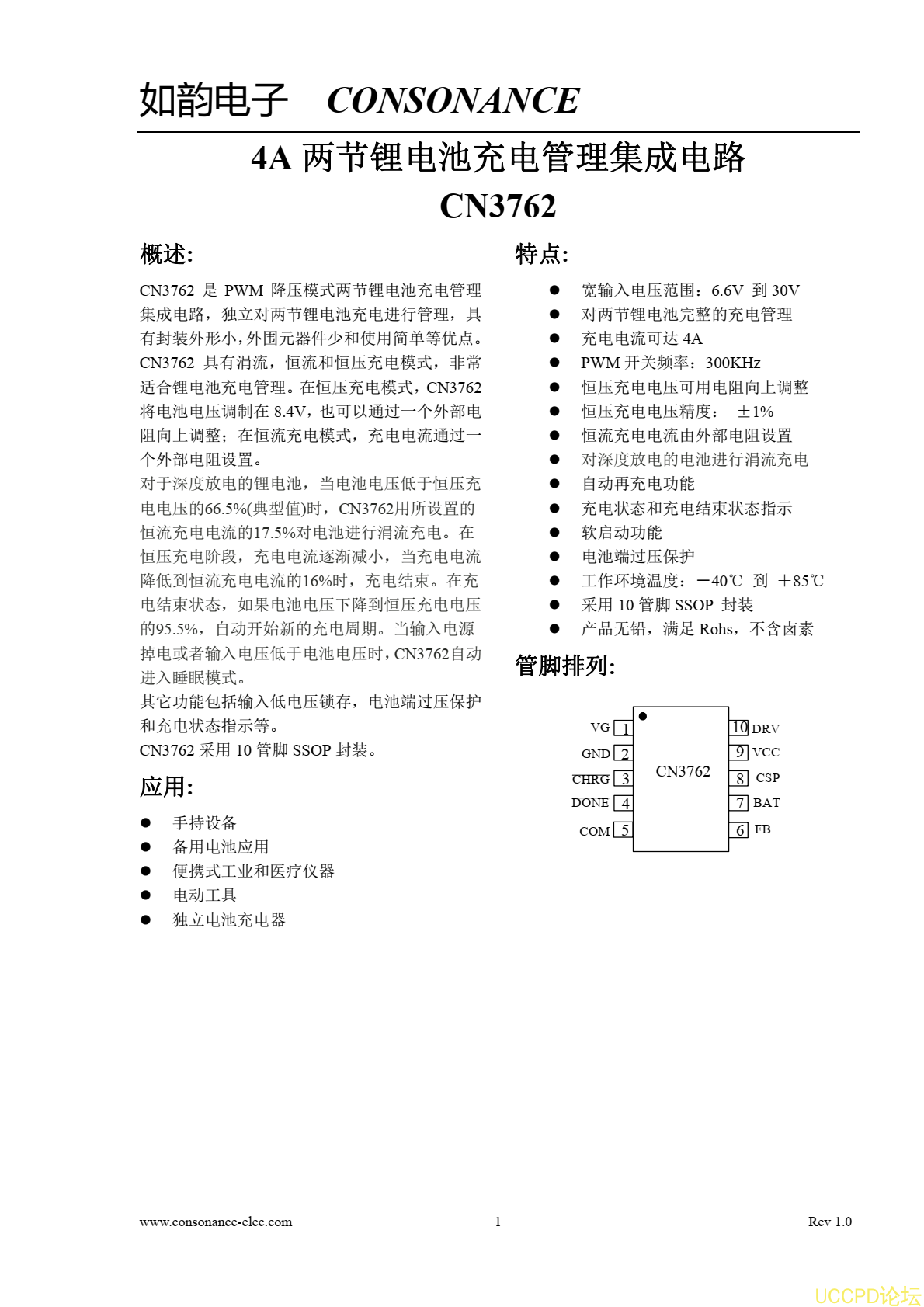 CN3762 採用 10 管腳 SSOP 封裝。