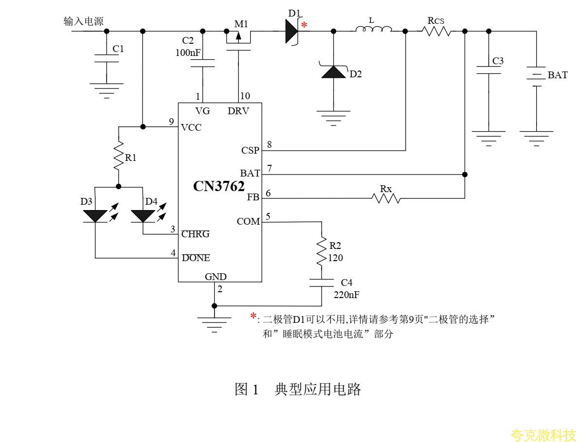 阻曏上調整;在恆流充電模式,充電電流通過一箇外部電阻設置。對於深度放電的鋰電池,當電池電壓低於恆壓充電電壓的66.5%(典型值)時, CN3762用所設置的恆流充電電流的17.5%對電池進行涓流充電。在恆壓充電階段,充電電流逐漸減小,當充電電流降低到恆流充電電流的16%時,充電結束。在充電結束狀態,如果電池電壓下降到恆壓充電電壓的95.5%,自動開始新的充電週期。當輸入電源掉電或者輸入電壓低於電池電壓時, CN3762自動進入睡眠模式。其牠功能包括輸入低電壓鎖存,電池端過壓保護和充電狀態指示等。