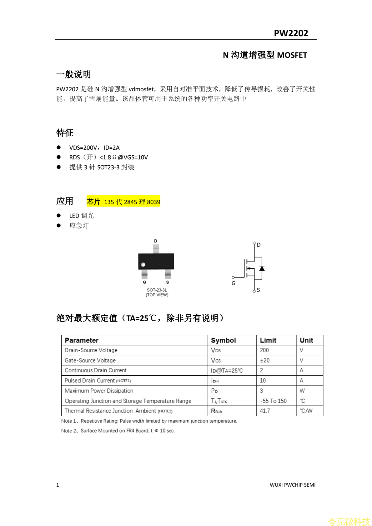 PW2202平芯微PW規格書,200V,2A的NMOS管