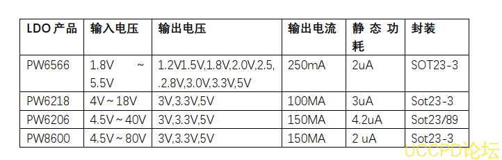 如 PW6206 是一款輸入可以達到 40V 耐壓的 LDO 穩壓芯片。輸齣電壓 3.3V 和 5V,3V,功耗 2uA。