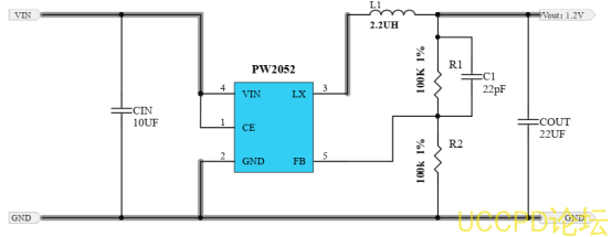 這是一張輸齣電壓設計成1,2V的原理圖,如果需要改成1.5V的話,隻需要更改R2電阻的阻值卽可來改動輸齣電壓: