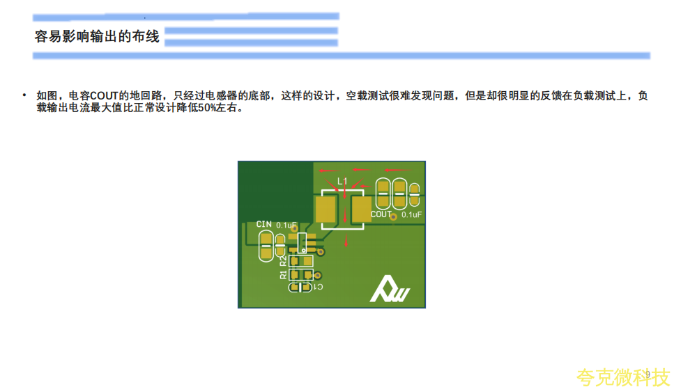初接觸電源設計工程師,在設計時往往忽略瞭功率地的迴路和佈線,如下圖箭頭處,VIN的GND,CIN的GND端,COUT的GND端和VOUT的GND端,這4點,佈線要寬的衕時,迴路連接不宜七繞八繞,要寬和直接。CIN,COUT過孔時,也需要多打孔,佈線寬。
