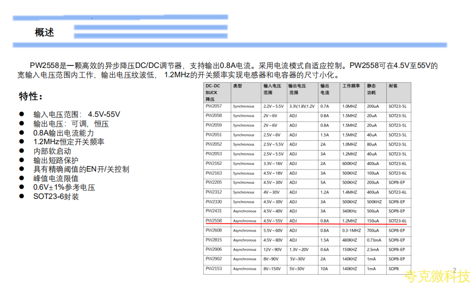 PW2558是一顆高效的異步降壓DC/DC調節器,支持輸齣0.8A電流。採用電流模式自適應控製。PW2558可在4.5V至55V的寬輸入電壓範圍內工作,輸齣電壓紋波低, 1.2MHz的開關頻率實現電感器和電容器的尺寸小化。