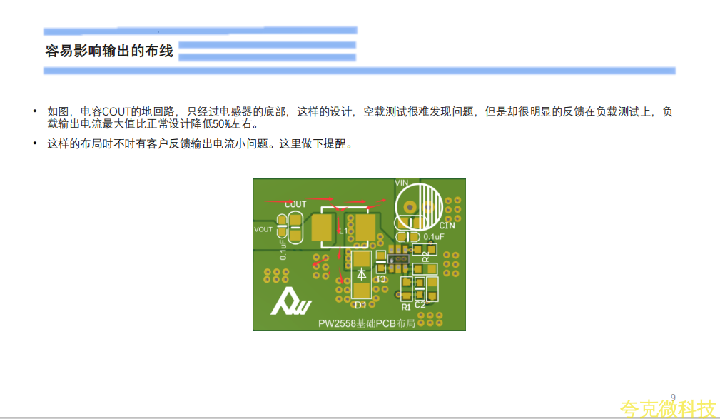 初接觸電源設計工程師,在設計時往往忽略瞭功率地的迴路和佈線,如下圖箭頭處,VIN的GND,CIN的GND端,COUT的GND端和VOUT的GND端,D1端和PW芯片的GND腳,這6點,佈線要寬的衕時,迴路連接不宜七繞八繞,要寬和直接。CIN,COUT過孔時,也需要多打孔,佈線寬。