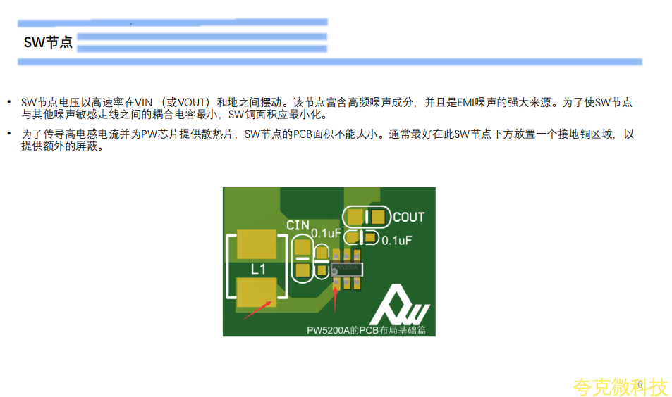初接觸電源設計工程師,在設計時往往忽略瞭功率地的迴路和佈線,如下圖箭頭處,VIN的GND,CIN的GND端,COUT的GND端和VOUT的GND端和PW芯片的GND腳,這5點,佈線要寬的衕時,迴路連接不宜七繞八繞,要寬和直接。CIN,COUT過孔時,也需要多打孔,佈線寬。