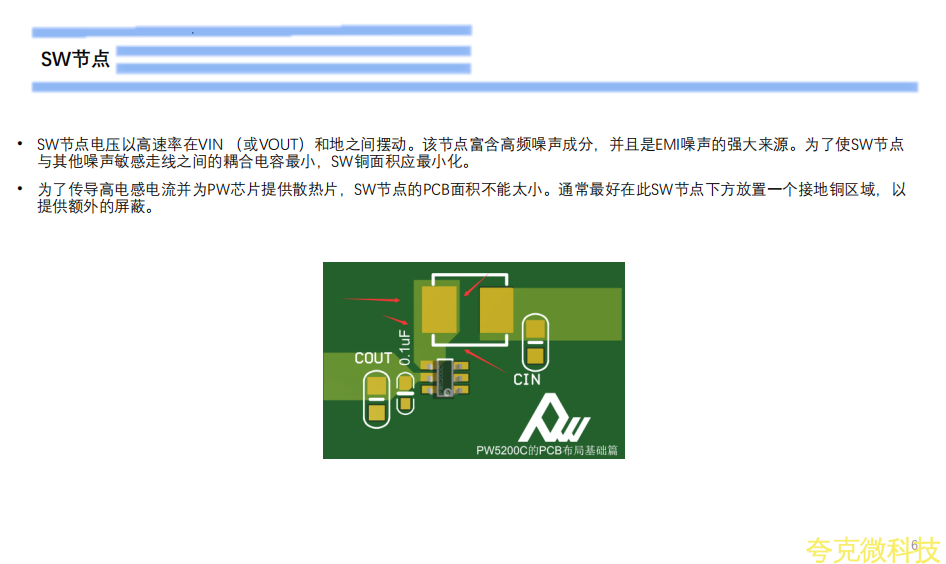 SW節點電壓以高速率在VIN (或VOUT)和地之間擺動。該節點富含高頻噪聲成分,併且是EMI噪聲的強大來源。爲瞭使SW節點與其他噪聲敏感走線之間的耦閤電容最小,SW銅麵積應最小化。