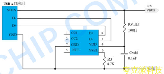 電壓選擇(VSEL引腳):在VSEL與GND間連接不衕阻值的電阻R8,可設定請求的電壓檔位。例如:連接1kΩ電阻對應9V,4.7kΩ對應12V,10kΩ對應15V,15kΩ對應20V,不連接(NC)則默認爲5V。