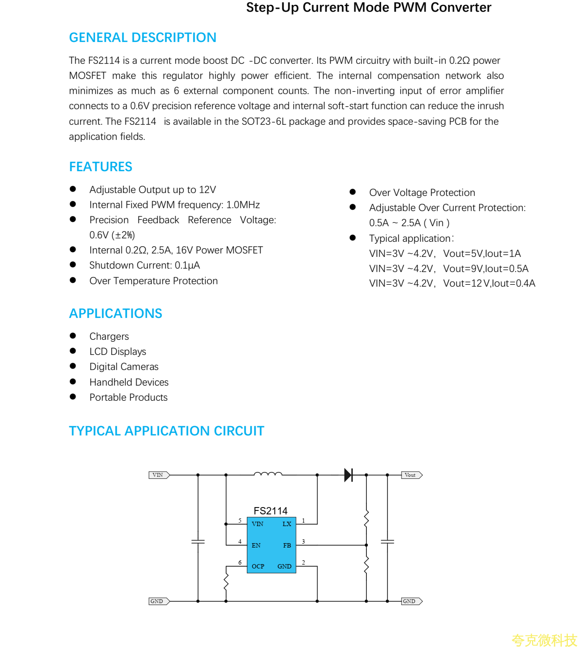 FS2114是陞壓DC-DC轉換器。其內置0.2Q功率MOSFET的PWM電路,使該穩壓器具有高效率