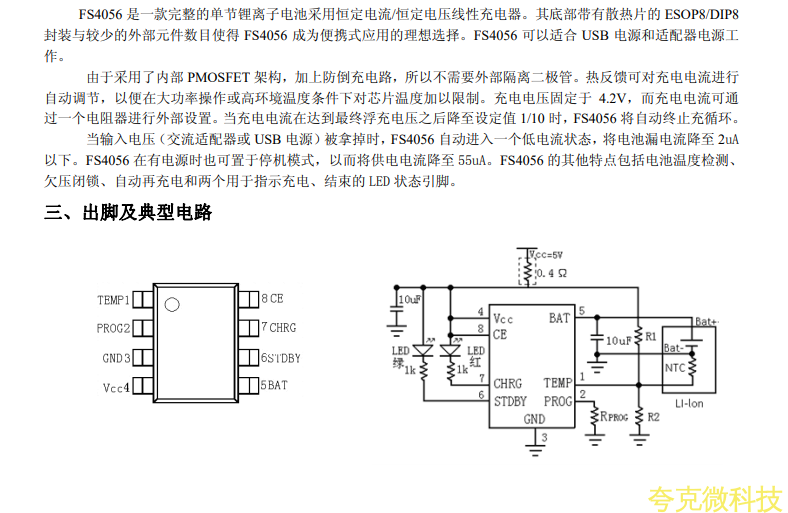 FS4067是一款工作於2.7V到6.5V的PFM陞壓型兩節鉀電池充電控製集成電路。FS4067採用恆流和恆樂模式對電池進行充電管理,內部集成有基準電壓源,電感電流檢測單元,電池電壓檢測電路和外置場效應晶體管驅動電路等,具有外部元件少,電路簡單等優點。