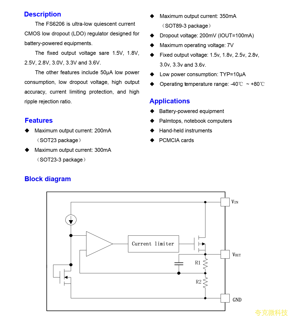 FS6206是超低靜態電流CMOS低壓差(LDO)穩壓器設計用於電池供電設備。固定輸齣電壓分彆爲1.5V、1.8V和1.5V,2.5V、2.8V、3.0V、3.3V和3.6V。其他功能包括50μA低功率功耗,低壓差,高輸齣精度、高紋波抑製比